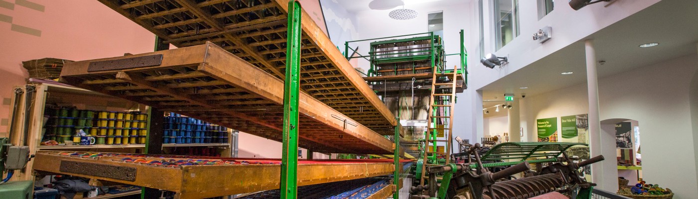 and side of the building. The Museum itself deserves to have every opportunity of advertisement as it is the sole Museum in Europe just about carpets and is inside a Grade 2 listed building. I was ushered into the building by one of the many friendly faced volunteers here that are the true heart of the Museum. Graham led me into the reception area with it’s astonishing views of the large hand looms that pumped out the carpets day in, day out. These looms I was told later are the only working looms in the Country and that I would be able to see them in action.