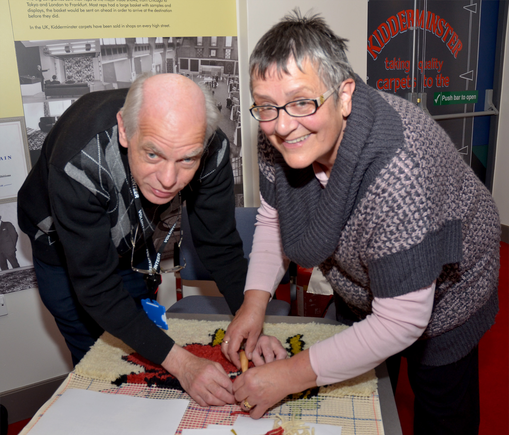 The image was translated for the rug design by Mick Lowe a former carpet designer, who is currently a volunteer at the Museum. The wool for the project was donated to the Museum as well so this project is truly making use of the Museum’s resources to commemorate World War One. In the photograph, Graham Kitchen, Museum volunteer, shows museum visitor, Nicki Griffiths, how to add a tuft.