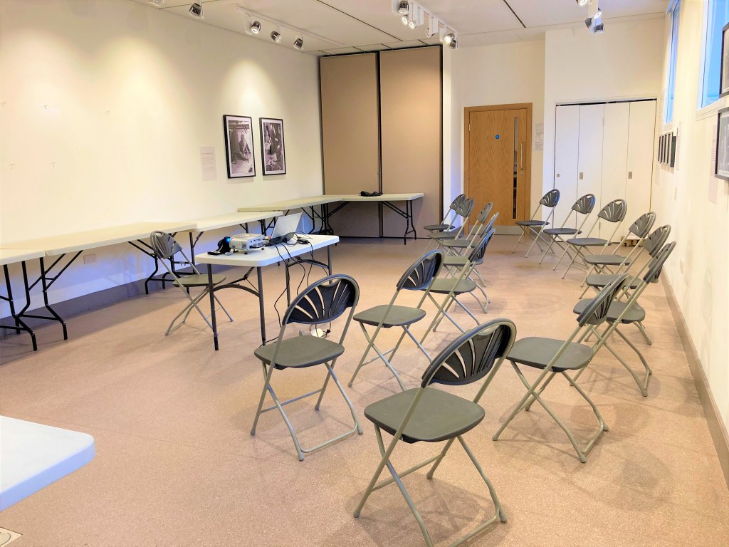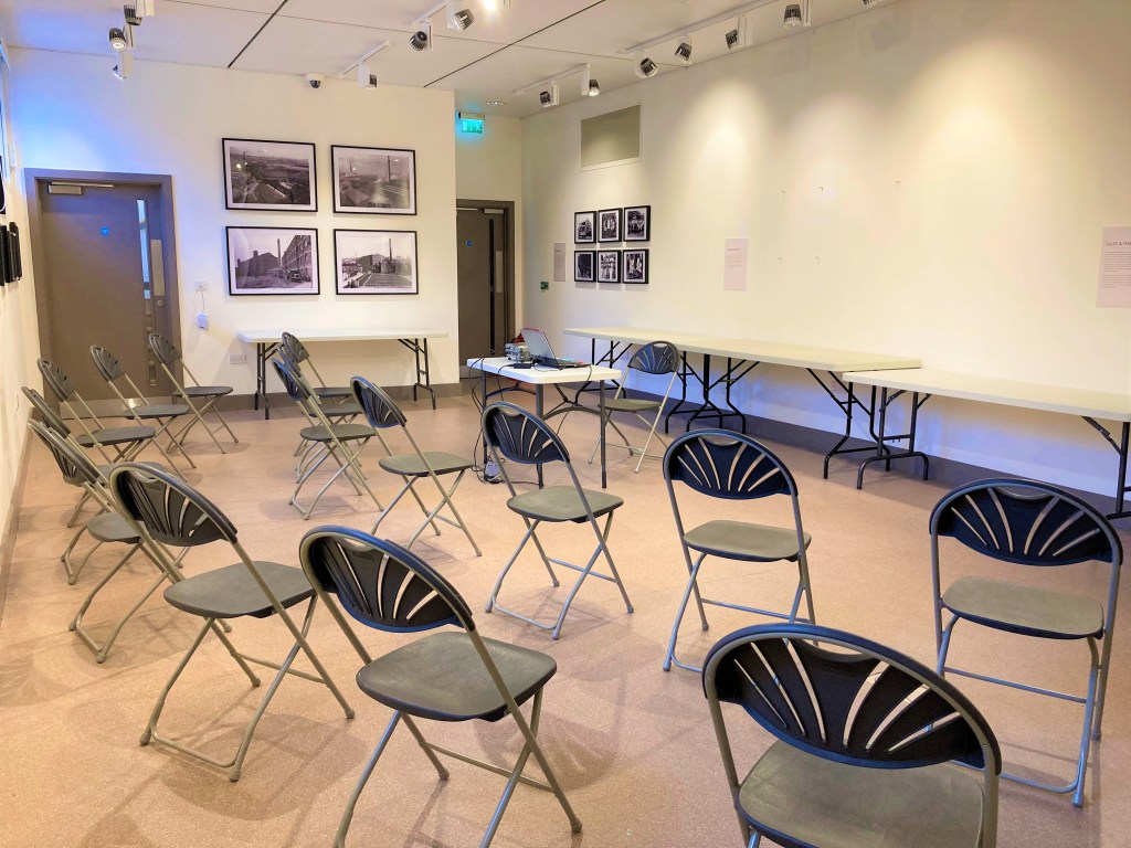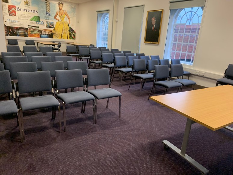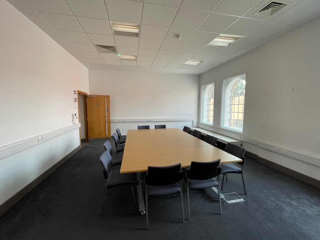On the first floor and is a flexible space which can be hired as a whole room for conferences or lectures seating up to 65 people. This room comes fully equipped with a projector, screen, wi-fi access and access to a kitchen.